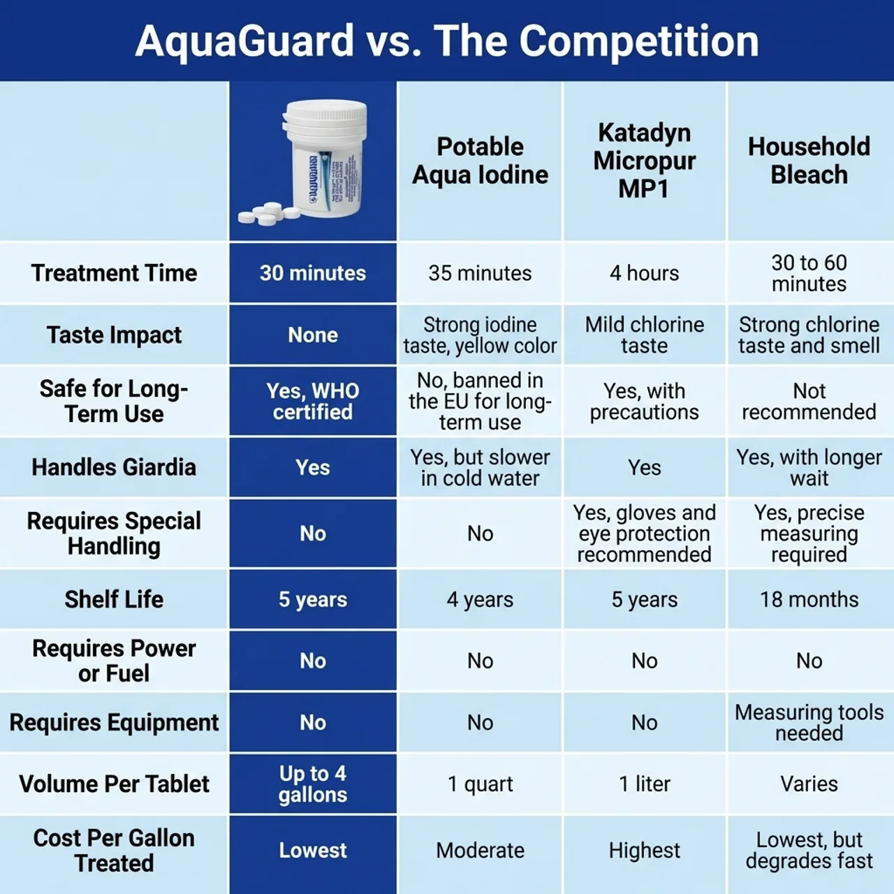 AquaGuard eliminates every one of those problems. 30 minutes. No taste. No equipment. No fuel. No power. Just clean water.